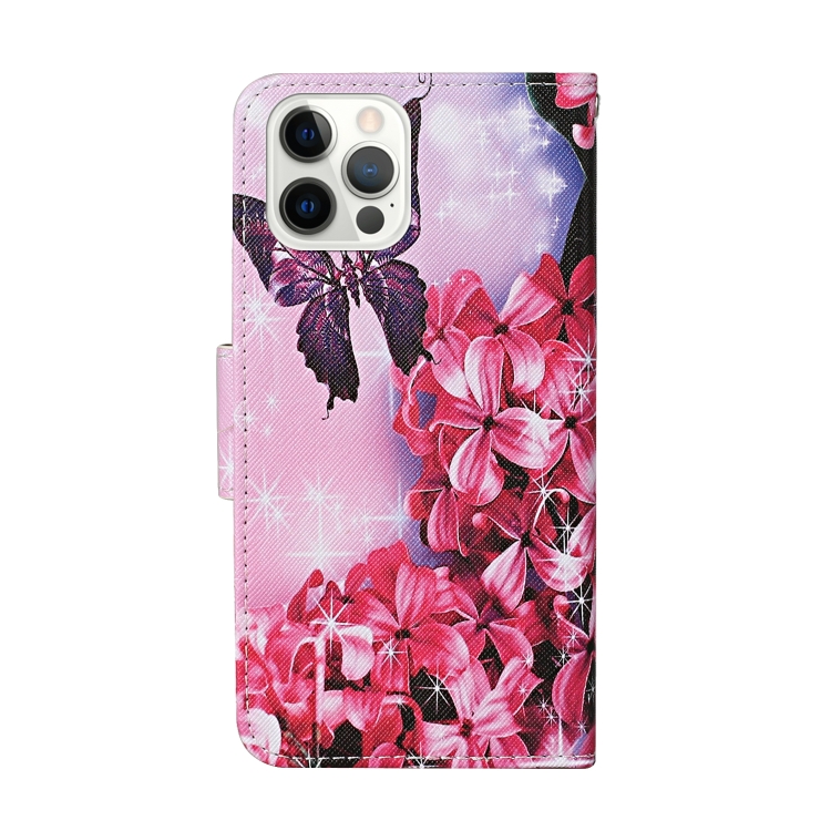 Estuche de Cuero para iPhone 13 Pro con Tapa y Patrón Dibujo Coloreado (Mariposa de Flor Roja)