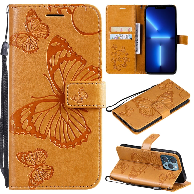 Estuche de Cuero para iPhone 13 Pro con Tapa Horizontal, Patrón Mariposa 3D, Soporte, Ranura Tarjeta, Billetera y Cordón (Amarillo)