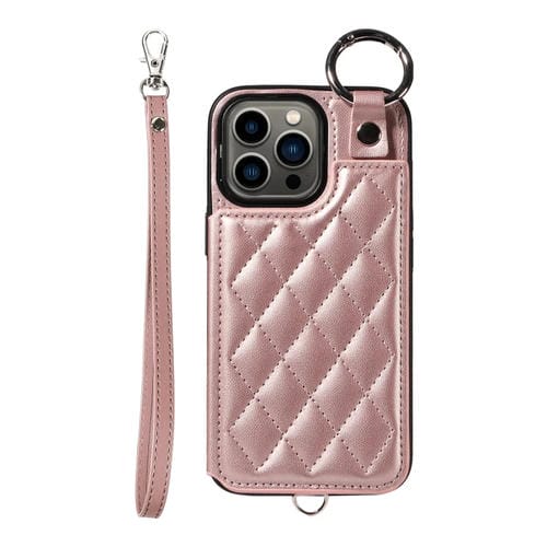 Estuche para Teléfono iPhone 13 Pro con Bolsa para Tarjetas Textura Rómbica y Cordón Corto (Oro Rosa)