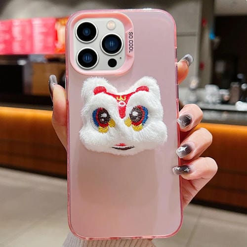 For iPhone 13 Pro New Year Lion Dance Plush Doll Phone Case (White Lion with Pink Back)