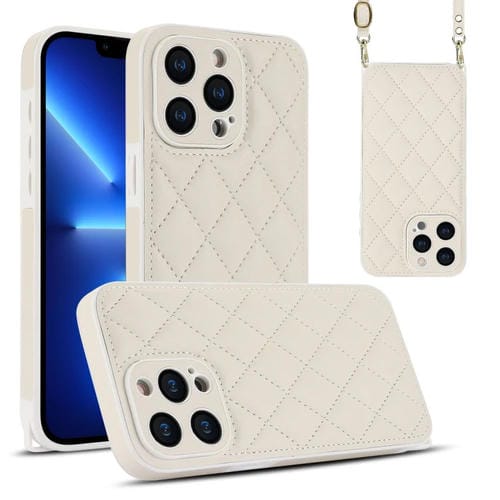 Estuche para teléfono iPhone 13 Pro Textura Rómbica con Cordón Doble (Blanco)