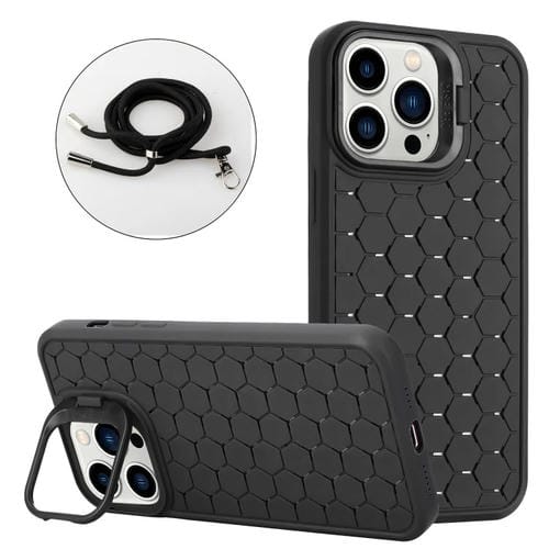 Funda para teléfono iPhone 13 Pro Honeycomb Radiating Holder TPU con Cordón (Negro)
