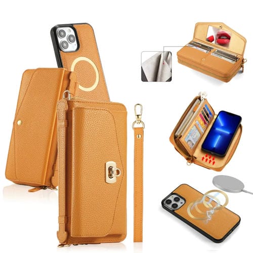 Funda para Teléfono iPhone 13 Pro Magsafe Crossbody Cartera Multifuncional con Cremallera de Cuero Litchi (Naranja)