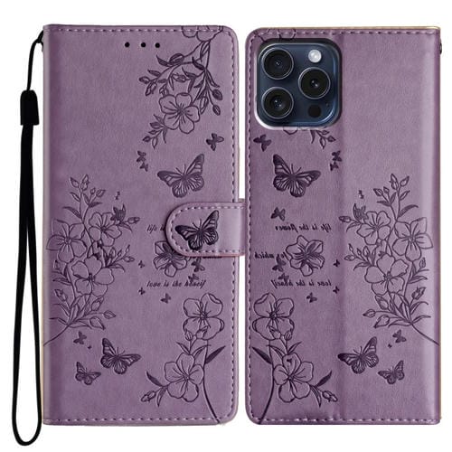 Funda de Cuero para iPhone 13 Pro Max Butterfly Love Flower En Relieve (Púrpura)