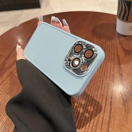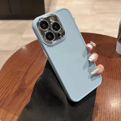 Caja de Teléfono para iPhone 13 Pro Max con Marco de Lente Galvanizada y Película de Lente (Azul Claro)