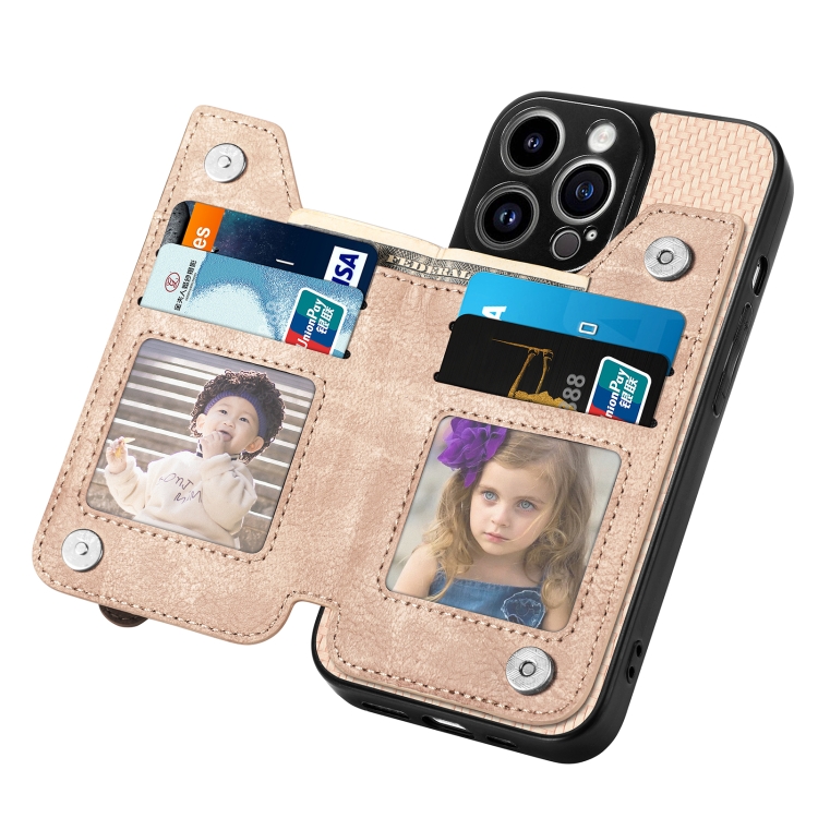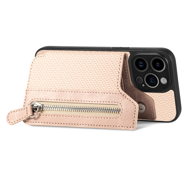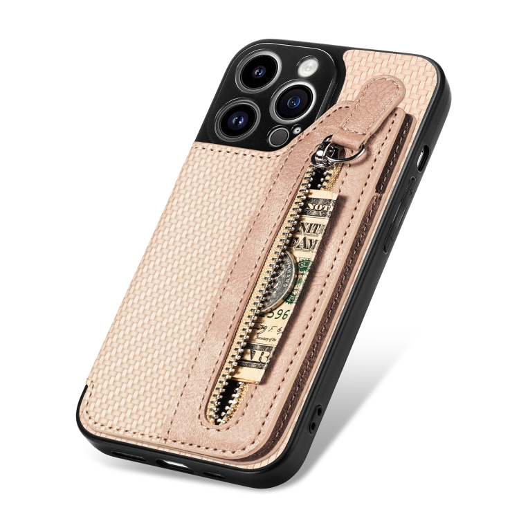 Funda para iPhone 13 Pro Max Carbon Fiber Horizontal Flip Zipper Wallet (Khaki)