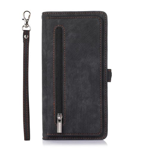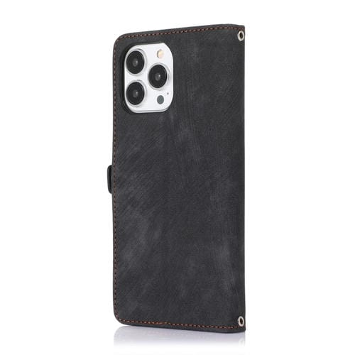Funda de cuero para iPhone 13 Pro Max con cremallera ranura para tarjeta y hebilla (Negro)