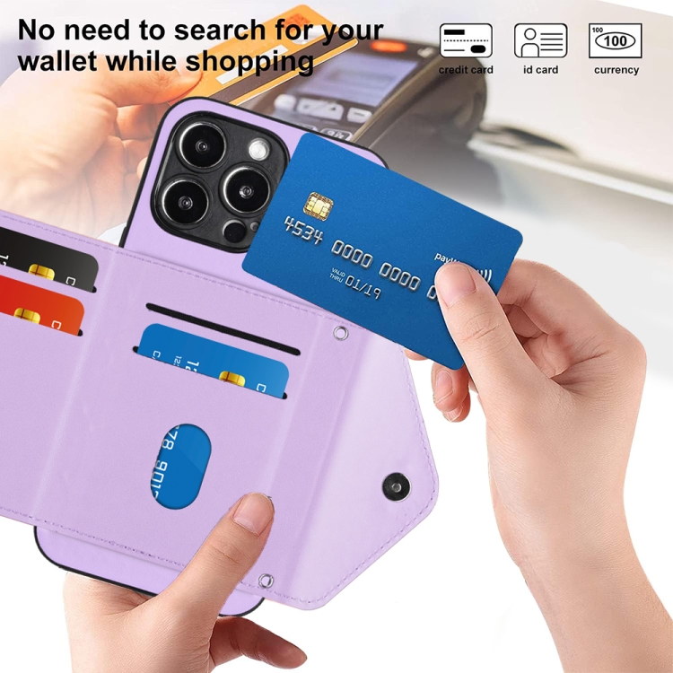 Estuche para Teléfono iPhone 13 Pro Max Rfid con Bolsa para Tarjetas Textura Rómbica y Cordón Largo (Púrpura Claro)