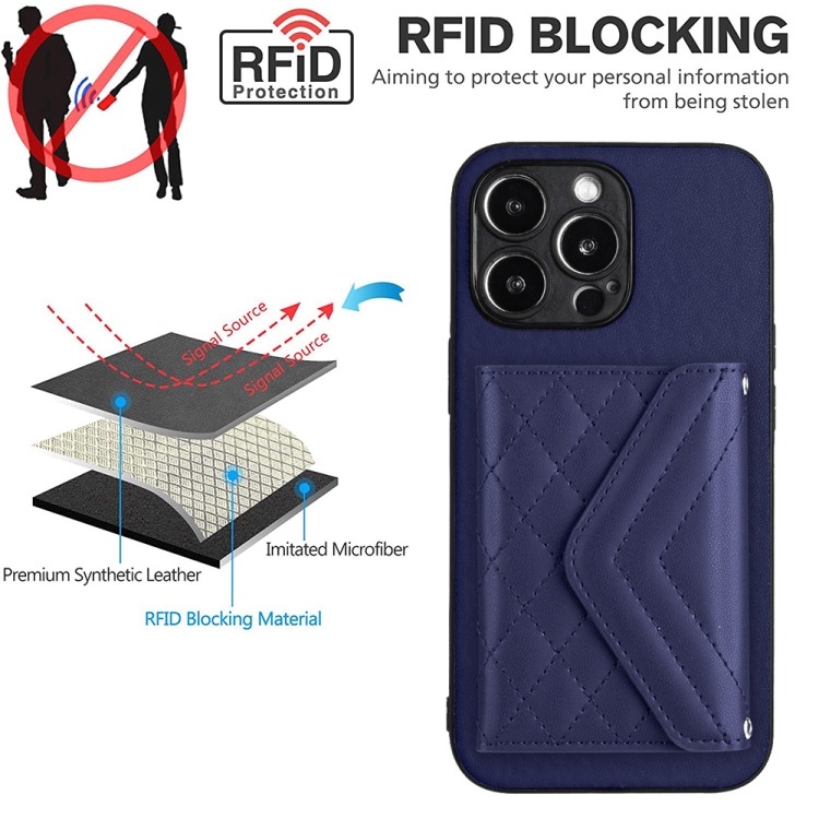 Estuche para Teléfono iPhone 13 Pro Max Rfid con Bolsa para Tarjetas Textura Rómbica y Cordón Largo (Púrpura Oscuro)