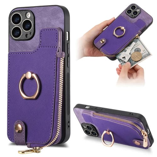 Funda para Teléfono iPhone 13 Pro Max con Anillo de Cuero Cruzado, Cremallera Vertical y Billetera Trasera (Púrpura)