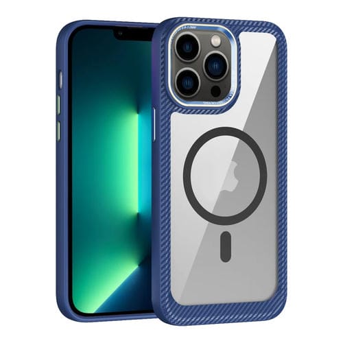 Caja de Teléfono iPhone 13 Pro Max Magsafe Panel Posterior Transparente Fibra de Carbono (Azul)