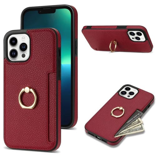 For iPhone 13 Pro Max Ring Card Litchi Leather Phone Back Case Cover(Red)