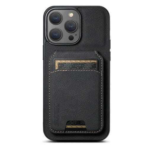 Funda para teléfono Suteni H02 para iPhone 13 Pro Max con soporte y billetera de cuero Litchi (Negro)