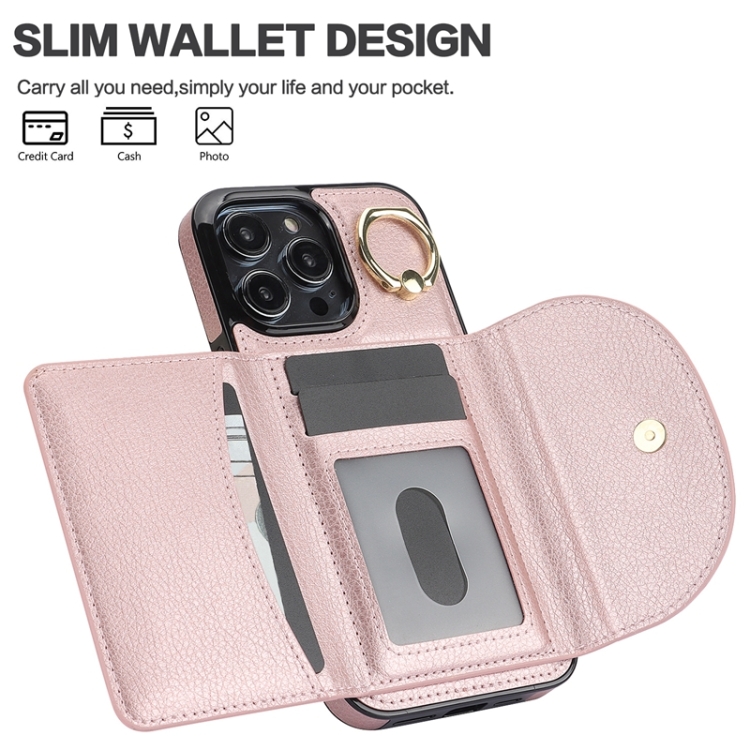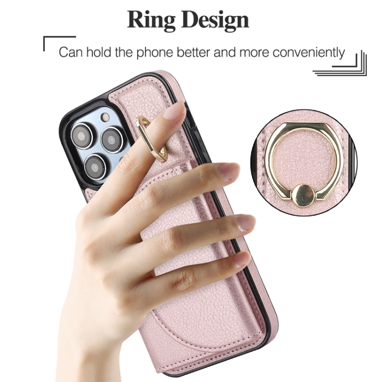 Estuche para teléfono Ym006 para iPhone 13 Pro Max con soporte para anillo y tarjeta con sensación de piel (Oro Rosa)