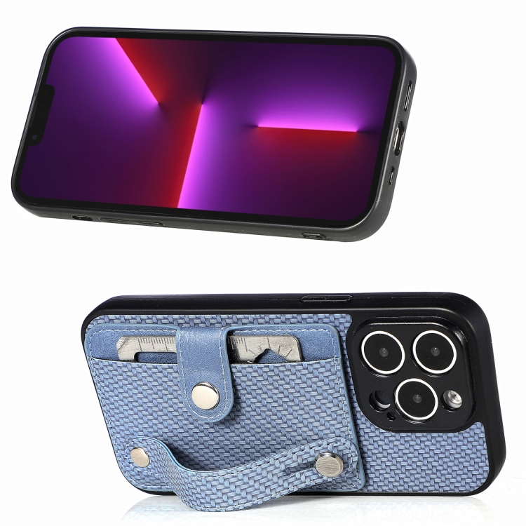 Funda para iPhone 13 Pro Wristband Kickstand Card Wallet Back Cover con Tool Knife (Azul)