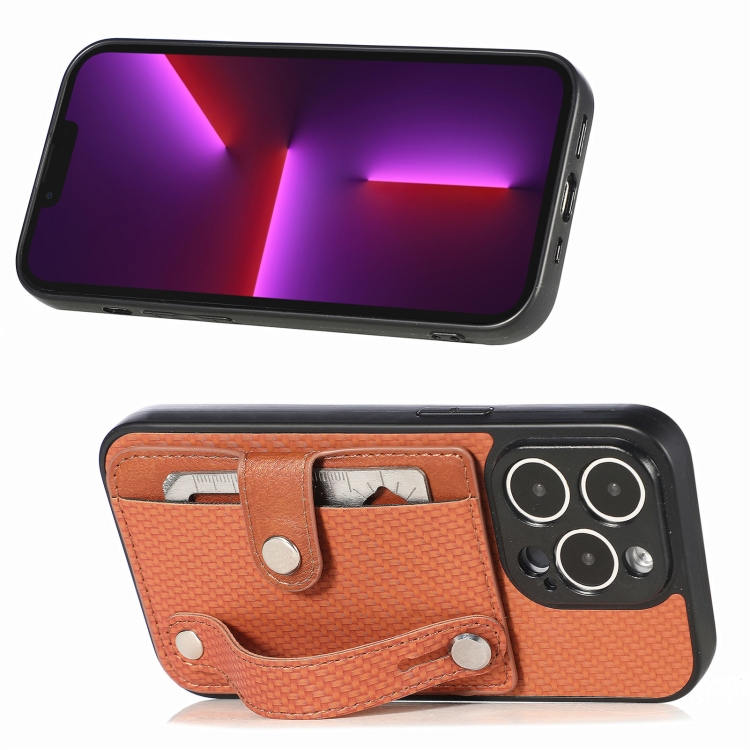 Funda para iPhone 13 Pro Wristband Kickstand Card Wallet Back Cover con Tool Knife (Marrón)