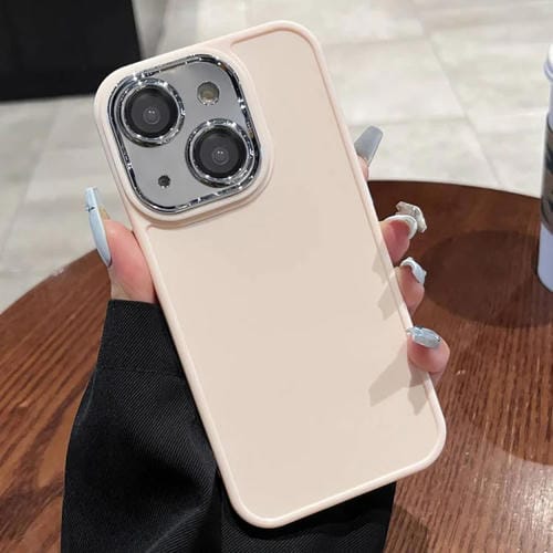 Caja de Teléfono para iPhone 14 con Marco de Lente Galvanizada y Película de Lente (Rosa Claro)