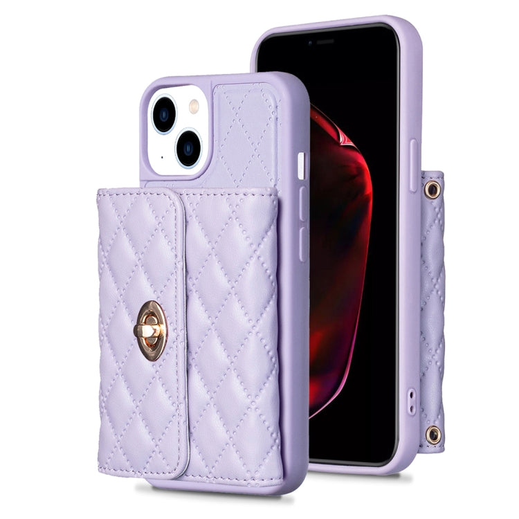 Caja de Teléfono de Cuero Rómbica para iPhone 14 Billetera con Hebilla de Metal Horizontal (Púrpura)