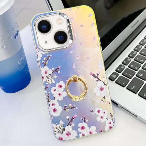 Caja de teléfono TPU para iPhone 14 con soporte de anillo y flor láser galvanoplastia (Flor de Ciruelo Ah18)