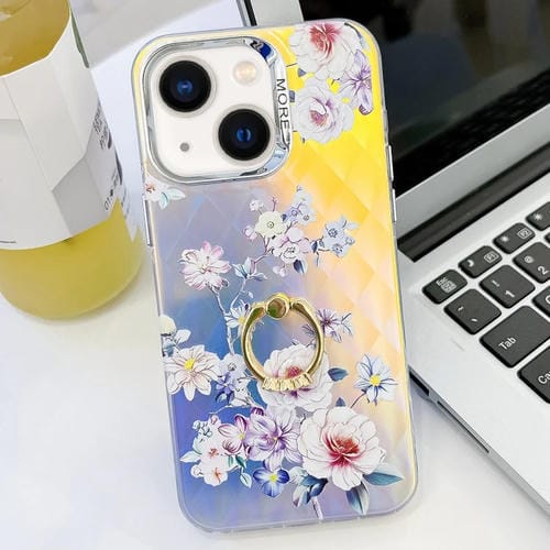Caja de teléfono TPU para iPhone 14 con soporte de anillo de flor láser de galvanoplastia (Rose Ah15)