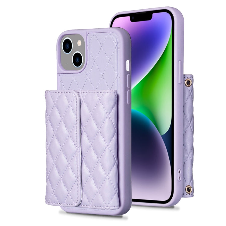 Estuche de Teléfono Cuero Rómbico con Billetera Horizontal para iPhone 14 (Púrpura)
