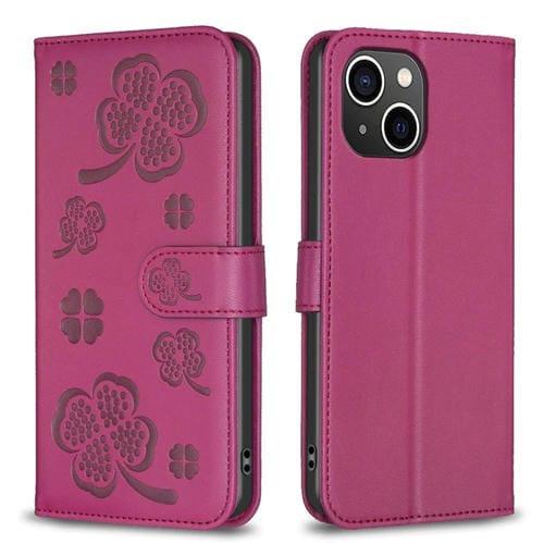 Funda de Cuero para iPhone 14 con Relieve de Cuatro Hojas (Rojo Rosa)