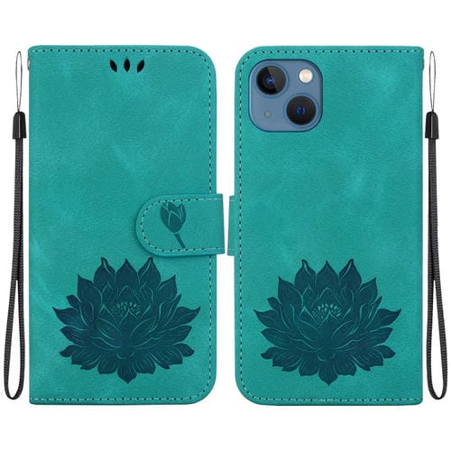 Funda para iPhone 14 Cuero con Relieve de Loto (Verde)