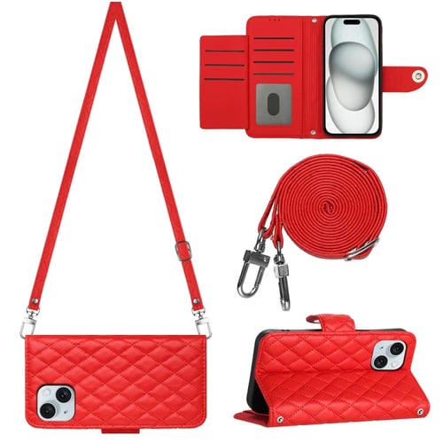 Funda para iPhone 14 Cuero con Tapa Textura Rómbica y Cordón Largo (Rojo)