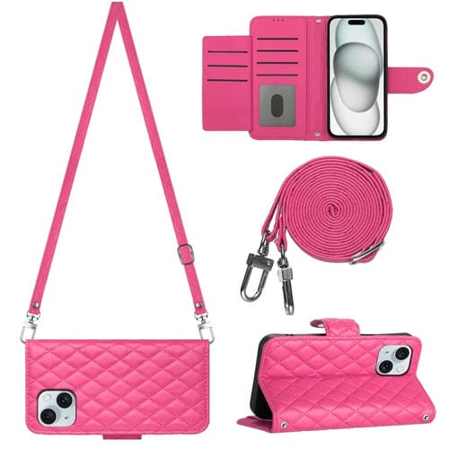 Funda de Cuero para iPhone 14 con Tapa Textura Rómbica y Cordón Largo (Rojo Rosa)