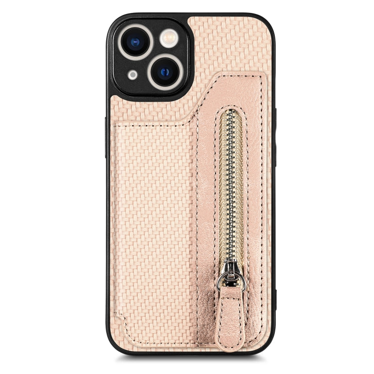 For iPhone 14 Carbon Fiber Horizontal Zipper Wallet Phone Case(Khaki)