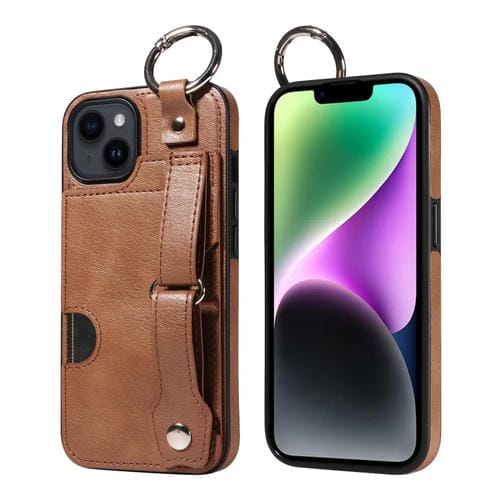 Funda para teléfono iPhone 14 con anillo y ranura para tarjeta con textura de pantorrilla (Marrón)