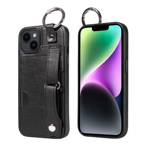 Funda para Teléfono iPhone 14 con Anillo y Ranura para Tarjeta con Textura de Pantorrilla (Negro)
