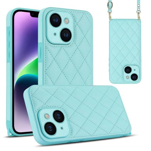 Funda para Teléfono iPhone 14 Textura Rómbica con Cordón Doble (Verde)