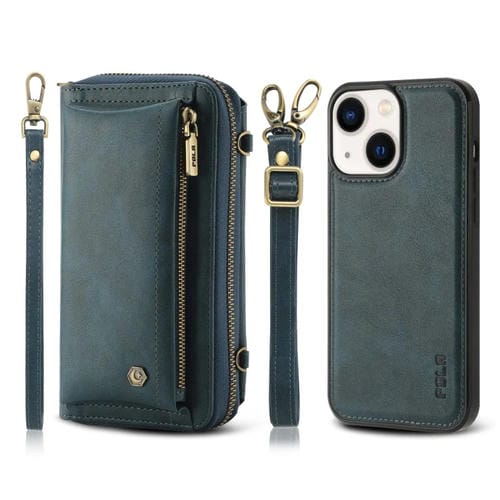 Funda para Teléfono iPhone 14 Cuero con Billetera y Cremallera Multifuncional Cruzada (Verde)