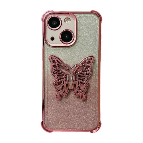 Funda para Teléfono TPU iPhone 14 a Prueba de Golpes con Mariposa 3D y Purpurina Galvanizada (Rosa Degradado)