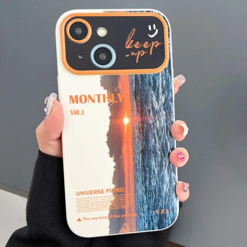 Funda para Teléfono TPU iPhone 14 con Ventana Grande y Patrón Amanecer del Mar (Blanco)