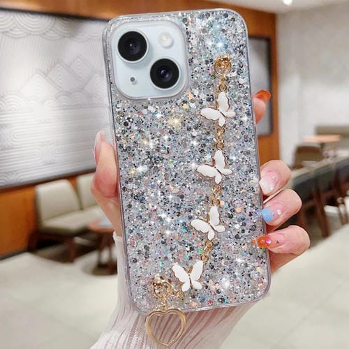 For iPhone 14 Starry Sequin Butterfly Chain Epoxy TPU Phone Case(Silver)