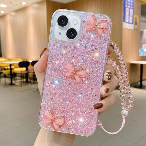 Funda para Teléfono TPU Epoxi iPhone 14 con Mariposa de Jade y Lentejuelas Estrelladas con Correa (Rosa)