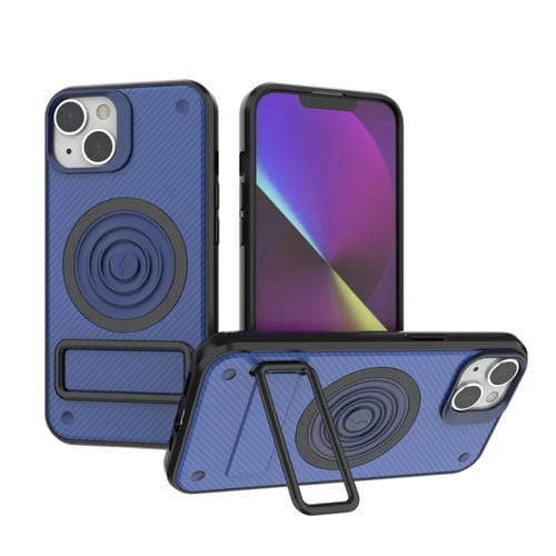 Funda para Teléfono iPhone 14 PC + TPU Textura Fibra de Carbono con Soporte de Metal (Azul)