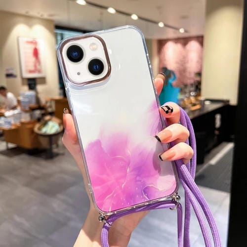 Funda para iPhone 14 Gold Halo Marble Pattern con Cordón (Púrpura)