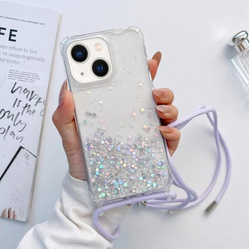 Funda para iPhone 14 Lanyard Glitter Epoxy Clear Phone Case (Púrpura)