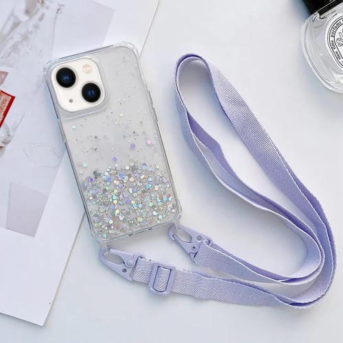 Funda para iPhone 14 Lanyard Glitter Epoxy Clear Phone Case (Púrpura)