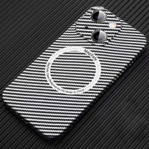 Estuche Magnético para Teléfono iPhone 14 Magsafe de Fibra de Carbono para PC con Película para Lentes (Blanco Plateado)