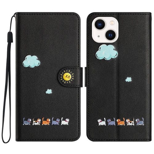 Funda de Cuero para Teléfono iPhone 14 Plus con Gatos de Dibujos Animados (Negro)