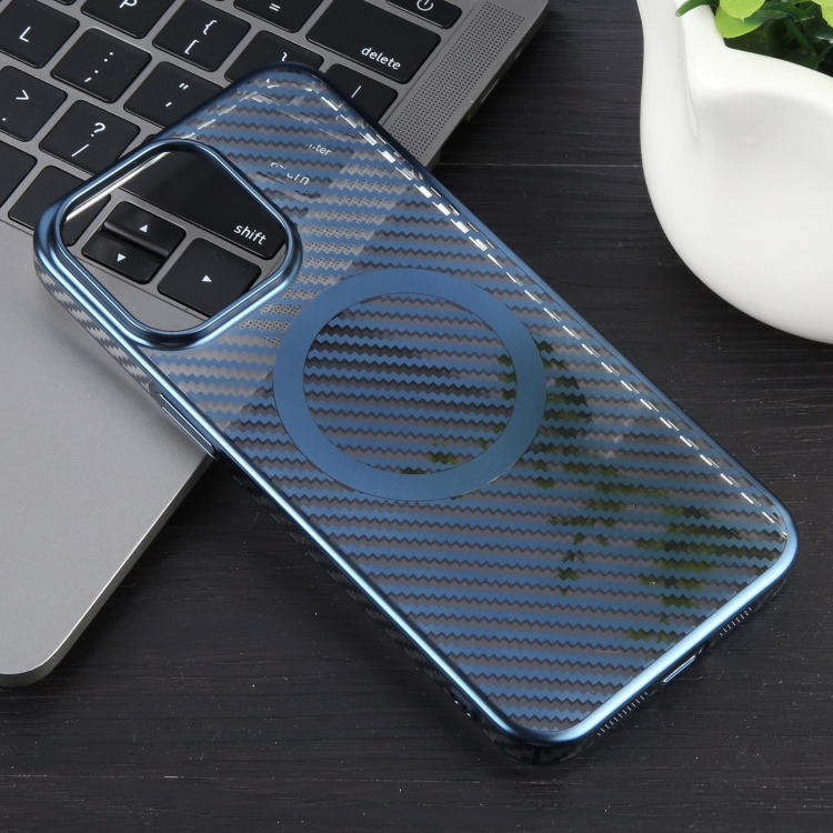 For iPhone 14 Plus Magsafe Phone Case Clear PC Case with 6D Silver Carbon Fiber (Dream Blue)