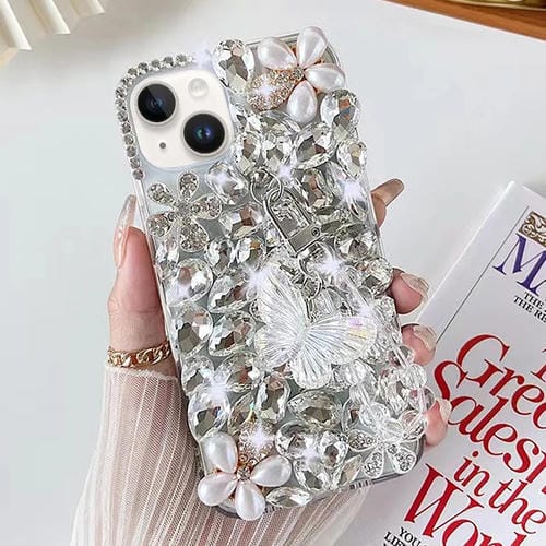 Funda para Teléfono iPhone 14 Plus PC con Incrustaciones de Diamantes y Mariposas (Blanco)