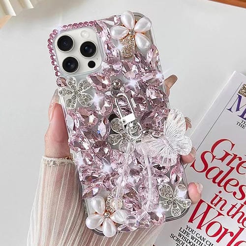 Funda para Teléfono iPhone 14 Pro PC con Incrustaciones de Diamantes y Mariposas (Rosa)