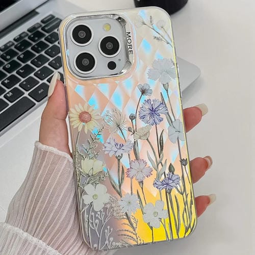 Caja del teléfono TPU para iPhone 14 Pro Galvanoplastia Láser Flor Textura (Crisantemo Ah5)