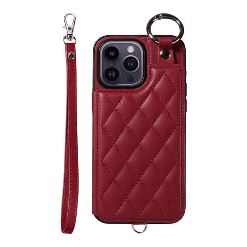 Estuche para teléfono iPhone 14 Pro Max con bolsa para tarjetas textura rómbica y cordón corto (Rojo Vino)