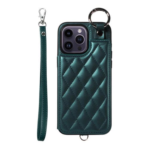 Estuche para Teléfono iPhone 14 Pro Max Bolsa para Tarjetas Textura Rómbica Cordón Corto (Verde)